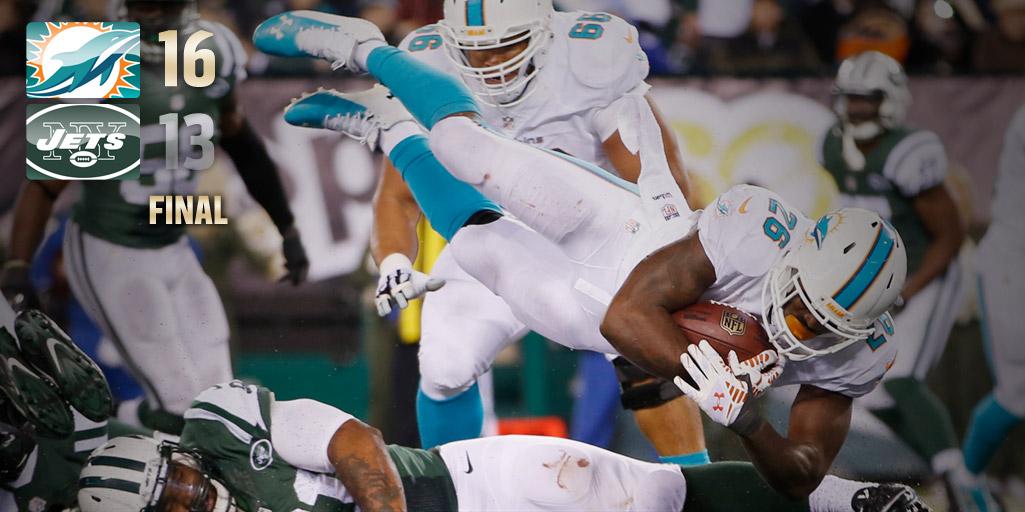 | Miller voa para marcar o único TD dos Dolphuns... |